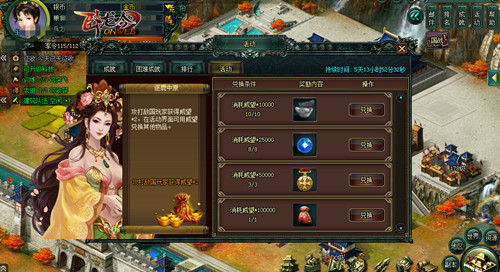 活动持续一个星期,结束后便立即开启下一个活动,逐鹿中原,攻打帝国扬威名,得双倍威望;征战四方,去征伐战胜副本,得更多神圣龙玉;腰缠万贯,去挑战突破,可以获得大量战功;五谷丰登,为战争做好准备,资源不尽粮田矿场奖励丰富,合理安排活动,三国霸业指日可待。